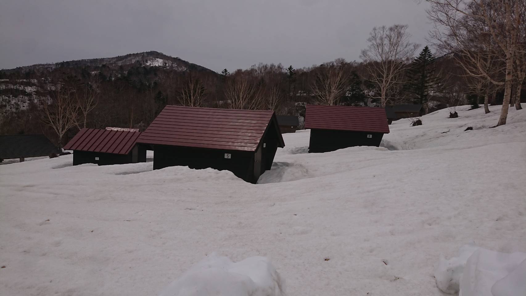 今年は残雪が多くバンガローがまだ雪に埋まってます。